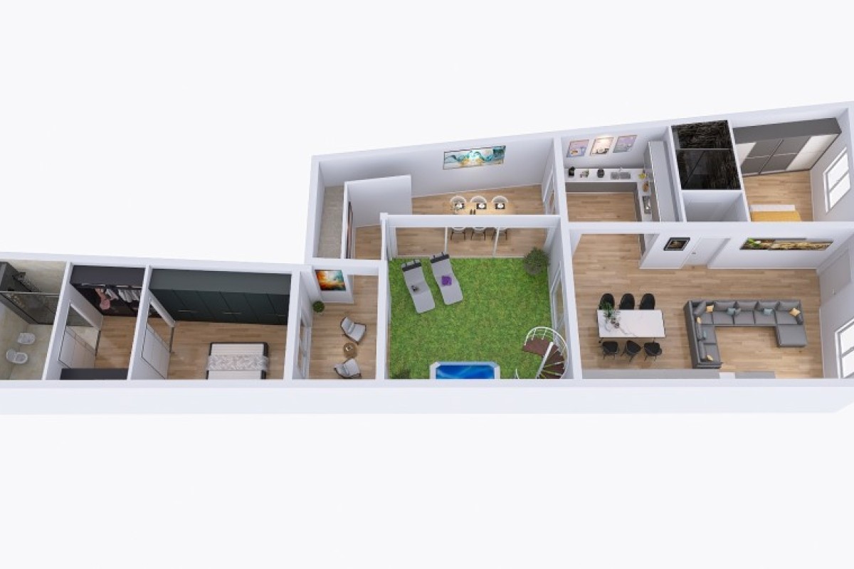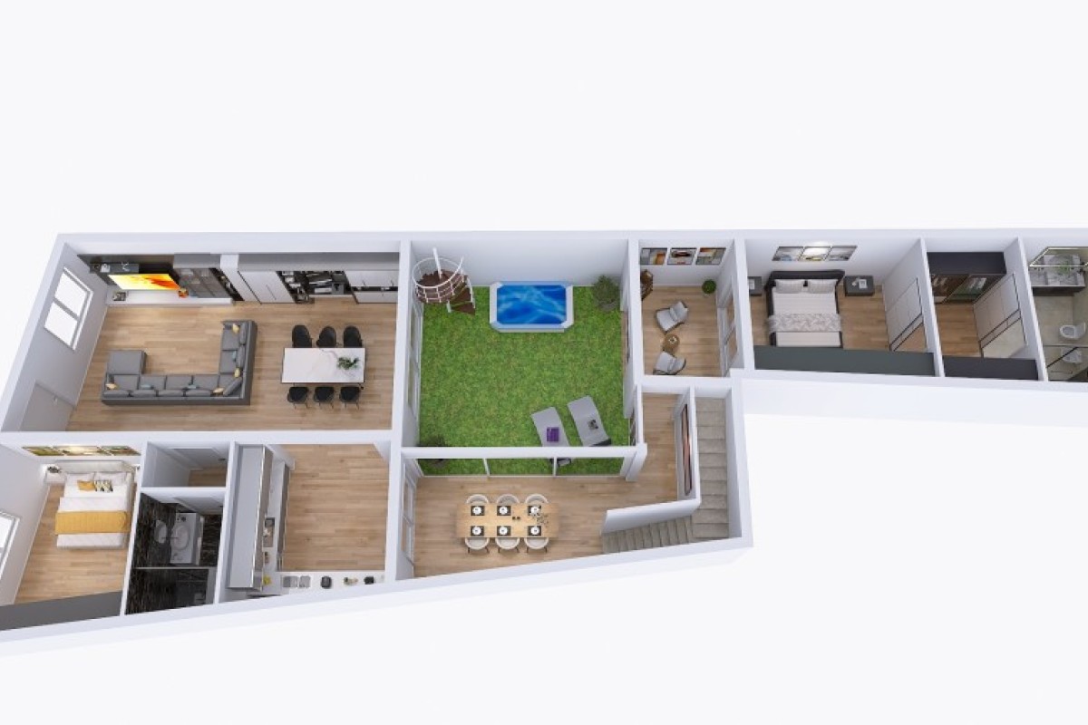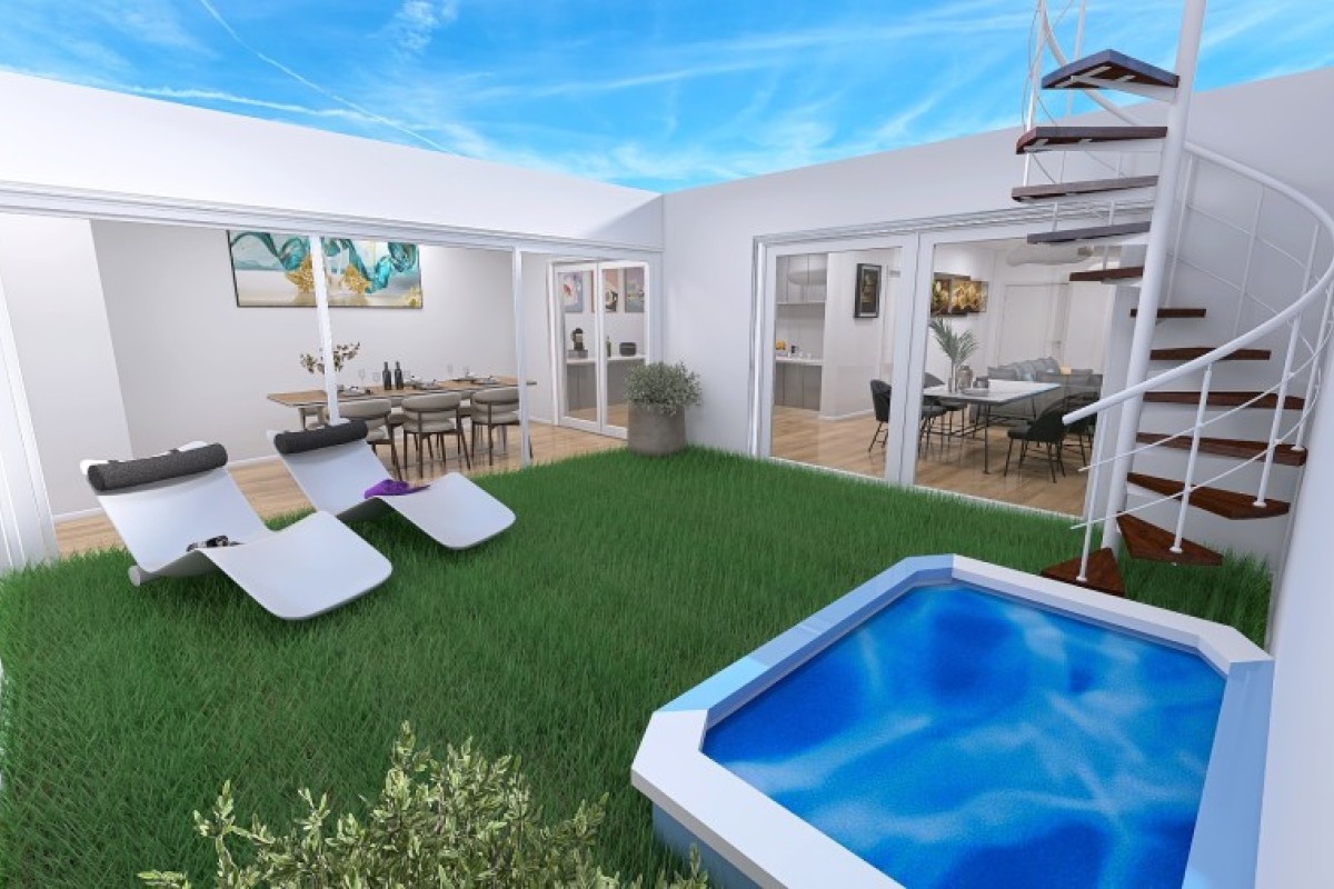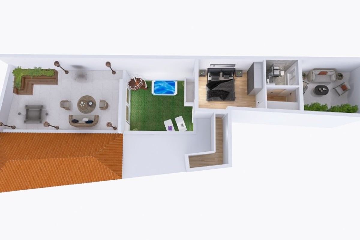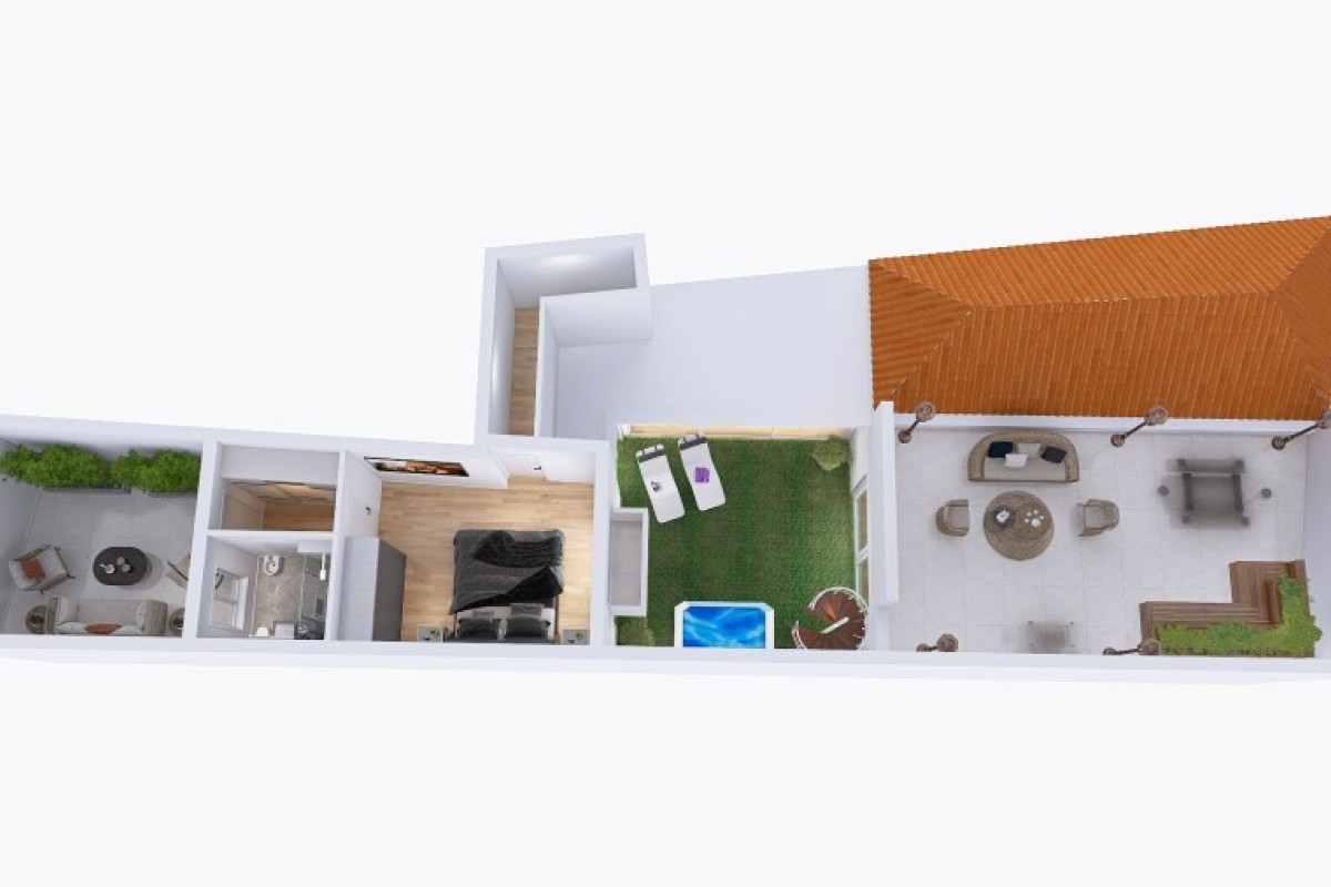 L'immobile è da ristrutturare, ma offre ottime potenzialità. L'idea progettuale suggerita prevede, al piano terra, un ampio soggiorno di 38 mq, una cucina separata, una camera matrimoniale, un bagno e l'accesso diretto al giardino di 60 mq. Attualmente gli ambienti della seconda porzione non sono collegati ma c'è in mezzo il giardino quindi, per ottimizzare gli spazi e collegare armoniosamente le due parti della casa, si consiglia la realizzazione di un loggiato con vetrate panoramiche VEPA. Questo potrebbe includere una zona relax, abbiamo poi una seconda camera matrimoniale con cabina armadio e bagno privato.